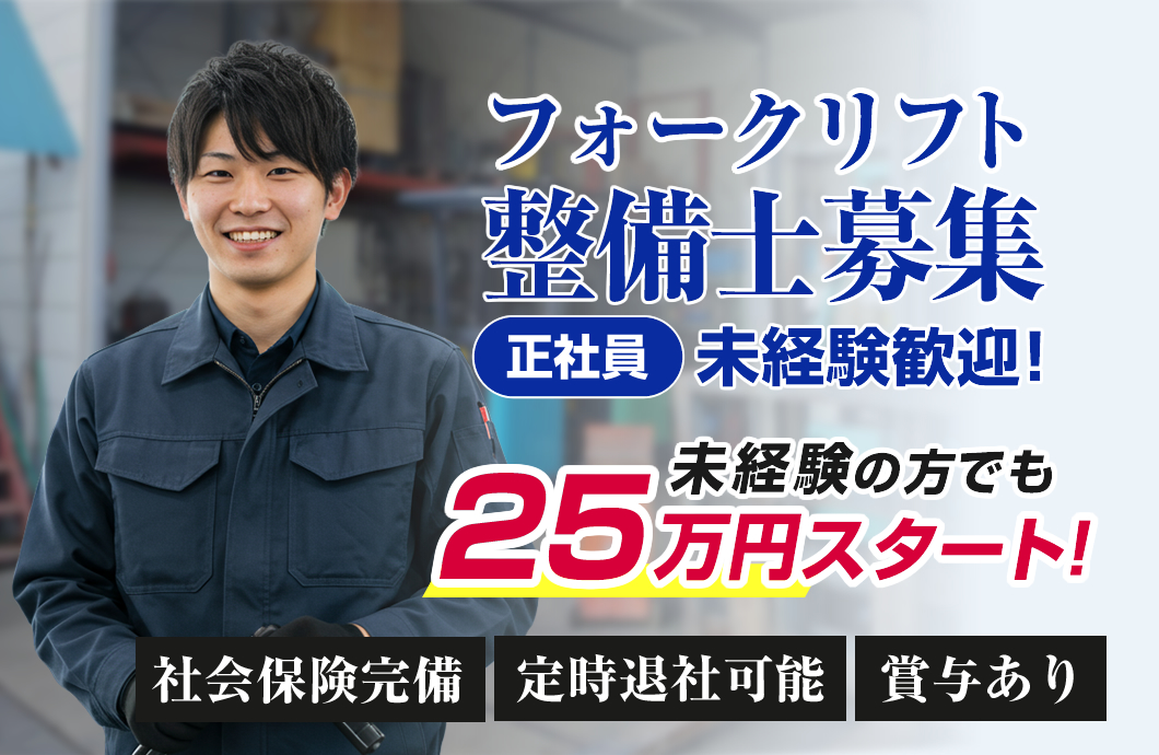 フォークリフト等の点検・修理をお任せします。経験者の方は裁量大きく活躍、経験が浅い方は先輩&代表がサポートします。 具体的には、当社から販売・レンタルしたフォークリフト等の整備をお任せ!稼働点検や部品交換など、定期メンテナンスや故障対応をお願いします。工場内での作業に加え、取引先へ出向き、その場での出張整備も行います。埼玉県南西部を中心とするエリアの、工場や物流倉庫等を1日に2~3件をまわります。作業時間が細かく決められているわけではないので、自分のペースで作業を進められます!